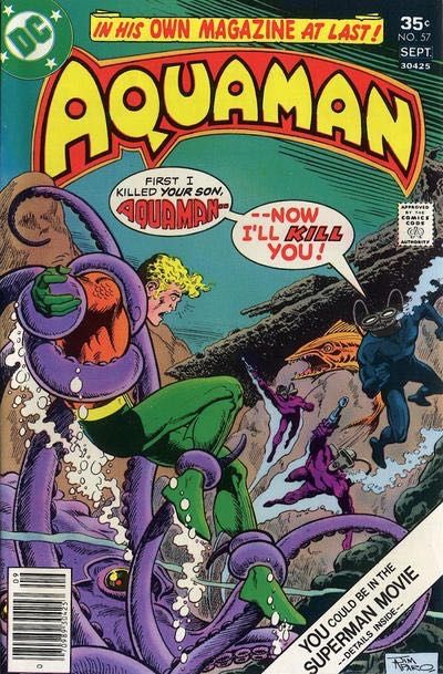 Aquaman wants revenge on Black Manta for the murder of his son, Aquababy. He tracks down the sunken submarine that Manta is using for his base of operations, but Black Manta activates a series of robotic marine lifeforms to intercept him. Aquaman briefly tangles with a huge robotic squid, but he manages to wrestle his way free.