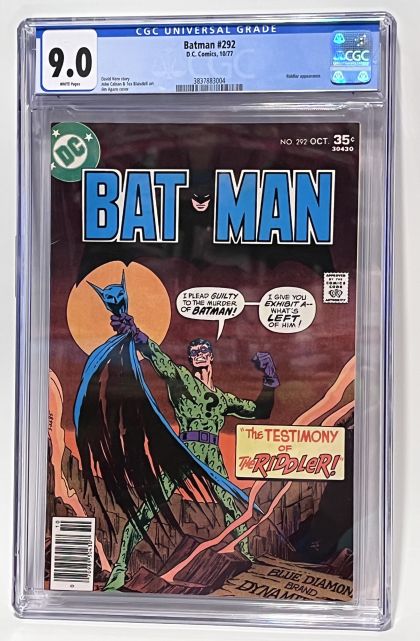 | Grader Notes | CGC Cert # 3837883004 Title Batman Issue 292 Issue Date 10/77 Issue Year 1977 Publisher D.C. Comics Grade 9.0 Page Quality WHITE Grade Date 03/31/2022 Grade Category Modern Art Comments David Vern story John Calnan & Tex Blaisdell art Jim Aparo cover Key Comments Riddler appearance. Grader Notes small crease right center of front cover breaks color spine stress lines breaks color |