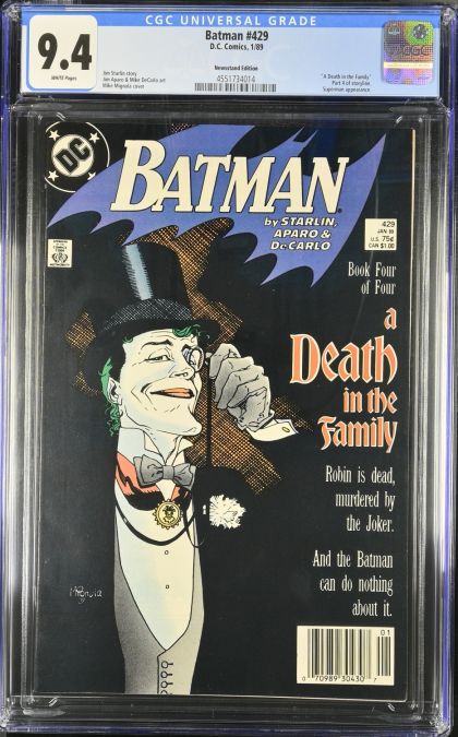 | Grader Notes | CGC Cert # 4551734014 Title Batman Issue 429 Issue Date 1/89 Issue Year 1989 Publisher DC Comics Grade 9.4 Page Quality WHITE Grade Date 2025-04-09 Label Category Universal Pedigree Newsstand Edition Art Comments Jim Starlin story Jim Aparo & Mike DeCarlo art Mike Mignola cover Key Comments Superman appearance. Grader Notes spine stress lines crease left bottom of back cover |