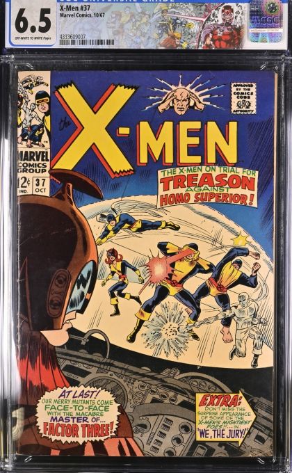 | Grader Notes | CGC Cert # Title X-Men Issue 37 Issue Date 10/67 Issue Year 1967 Publisher Marvel Comics Grade 6.5 Page Quality OFF-WHITE TO WHITE Grade Date 10/16/2023 Grade Category Universal Art Comments Roy Thomas story Ross Andru and Don Heck cover and art Key Comments 1st appearance of the Mutant-Master. Blob, Vanisher, Mastermind, Unus and Changeling appearance. Grader Notes moderate creasing to cover moderate dent cover moderate spine stress lines to cover |