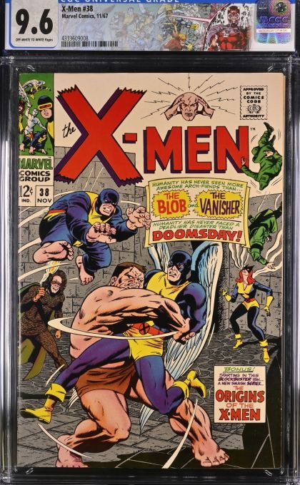 | Grader Notes | CGC Cert # Title X-Men Issue 38 Issue Date 11/67 Issue Year 1967 Publisher Marvel Comics Grade 9.6 Page Quality OFF-WHITE TO WHITE Grade Date 10/16/2023 Grade Category Universal Art Comments Roy Thomas story, Dan Adkins cover Don Heck, George Roussos, Werner Roth and John Verpoorten art Key Comments Blob, Vanisher, Changeling and Mutant-Master appearance. ""Origins of X-Men"" backup stories begin. Grader Notes light spine stress lines to cover very light creasing to cover |