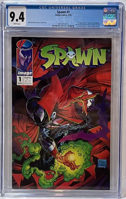 | Grader Notes | CGC Cert # 4010053016 Title Spawn Issue 1 Issue Date 5/92 Issue Year 1992 Publisher Image Comics Grade 9.4 Page Quality WHITE Grade Date 11/09/2022 Grade Category Modern Art Comments Todd McFarlane story, cover & art Key Comments 1st appearance of Spawn (Al Simmons). Pitt pin-up by Dale Keown & Spawn pin-up by George Prez. Pull-out Spawn poster. Grader Notes Unavailable |