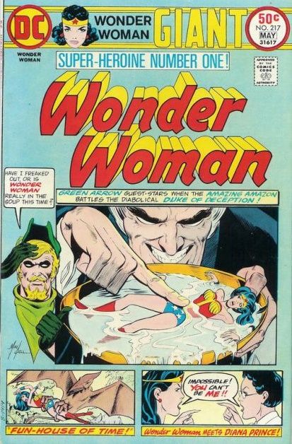 Green Arrow is the latest Justice League monitor over Wonder Woman, and he trails her in the U.N. Building as Oliver Queen only to see her meeting with--Green Arrow! The phony GA is really the Duke of Deception, who confuses Diana by referring to her as Supergirl and then leaving. All over the building, delegates and officials are confused by Deception's illusions. Wonder Woman finds the Duke and attempts to lasso him, only to learn that the “Duke” she roped is an illusion and the real Deception now has her pent in the magic lasso. However, Wonder Woman penetrates Deception's illusions, breaks free, makes the Duke unsure of himself, and topples his power. Trapping him with the magic lasso, Wonder Woman makes him confess that he hoped to drive the U.N. delegates mad and plunge the world into war, thus making Mars, god of War, bow to him. Green Arrow, however, has been affected by the Duke's deceptions, and requires some hypnosis by Batman to set him straight.