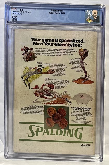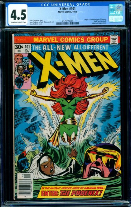 | Grader Notes | CGC Cert # 4129221018 Title X-Men Issue 101 Issue Date 10/76 Issue Year 1976 Publisher Marvel Comics Grade 4.5 Page Quality OFF-WHITE TO WHITE Grade Date 10/04/2022 Grade Category Modern Art Comments Chris Claremont story Dave Cockrum & Frank Chiaramonte art Dave Cockrum cover Key Comments Origin & 1st appearance of Phoenix. Black Tom Cassidy & Juggernaut appearance. Grader Notes crease right center of front cover breaks color soiling back cover multiple staple rusted |