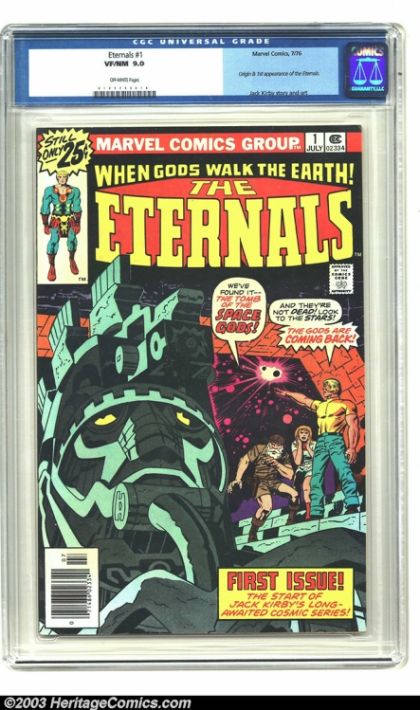 The Eternals #1 (Marvel, 1976) CGC VF/NM 9.0 Off-white pages. Origin and first appearance of the Eternals. Jack Kirby cover, script, and interior art. Overstreet 2003 VF/NM 9.0 value = $15; NM 9.4 value = $18.