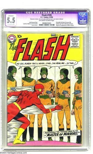 The Flash #105 (DC, 1959) CGC Apparent FN- 5.5 Extensive (P) Off-white to white pages. Following his successful stint in four "try-out" issues of Showcase, the Scarlet Speedster gets his own title, with numbering picking up where the Golden Age Flash Comics left off. In this first issue, the Fastest Man Alive (whose origin is recapped) encounters the Mirror Master, making his debut. Featuring art by fan-favorite Carmine Infantino, this would become one of the Silver Age's best-loved superhero comics. This copy has been very attractively restored; CGC notes, "Restoration includes: color touch, pieces added, tear seals, cover cleaned, reinforced." Overstreet 2004 GD 2.0 value = $415; VG 4.0 value = $830; FN 6.0 value = $1,245.