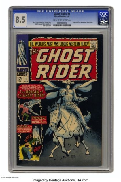 The Ghost Rider #1 (Marvel, 1967) CGC VF+ 8.5 Cream to off-white pages. Origin and first appearance of the Ghost Rider. Dick Ayers cover. Ayers and Vince Colletta art. Overstreet 2005 VF 8.0 value = $65; VF/NM 9.0 value = $93. CGC census 03/05: 7 in 8.5, 7 higher.