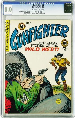 Gunfighter #6 (EC, 1948) CGC VF 8.0 Off-white to white pages. This pre-Trend Western has a Johnny Craig cover, with interior art by Graham Ingels and H. C. Kiefer. And in addition to all of the Western tales, there's... Moon Girl? Sure enough, Sheldon Moldoff's superheroine is in these pages. These pre-Trend books are fun, and this was the first copy of this issue we'd seen in years! Overstreet 2006 VF 8.0 value = $340. CGC census 4/06: 2 in 8.0, 2 higher.