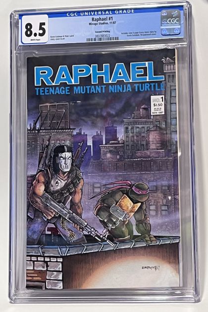 | Grader Notes | CGC Cert # 3837883022 Title Raphael Issue 1 Issue Date 11/87 Issue Year 1987 Publisher Mirage Studios Variant Second Printing Grade 8.5 Page Quality WHITE Grade Date 03/31/2022 Grade Category Modern Art Comments Kevin Eastman & Peter Laird story, cover & art Key Comments Includes new 8 page Casey Jones story by Kevin Eastman. Wraparound cover. Grader Notes light creasing to cover light spine stress lines to cover |