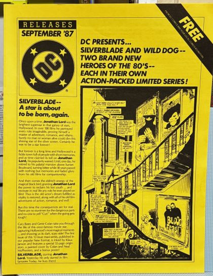 A monthly 4-page 8-1/2in. x 11in. illustrated consumer newsletter featuring DC comic releases for each month. This month: Silverblade is cover spotlighted, featuring Gene Colan/Klaus Janson art. The interior features cover art for Flash (1987 2nd Series) Annual #1 by Jackson Guice and Ed Hannigan, and Wild Dog (1987) #1 by Terry Beatty and Dick Giordano. Plus: a page of interior art by Pat Broderick for Lords of the Ultra Realm Special (1987) #1.