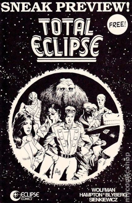 Promotional booklet featuring the upcoming "Total Eclipse" series. Sample pages by Bo Hampton and Willie Blyberg. 6-5/8 in. x 10-1/8 in.; black and white; 8 pages.