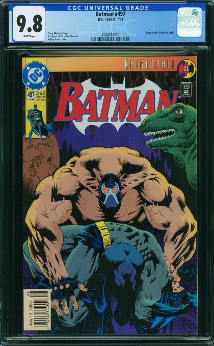 | Grader Notes | CGC Cert # 4244388022 Title Batman Issue 497 Issue Date 7/93 Issue Year 1993 Publisher D.C. Comics Grade 9.8 Page Quality WHITE Grade Date 05/03/2023 Grade Category Modern Art Comments Doug Moench story Jim Aparo & Dick Giordano art Kelley Jones cover Key Comments Bane breaks Batman's back. Grader Notes Unavailable |