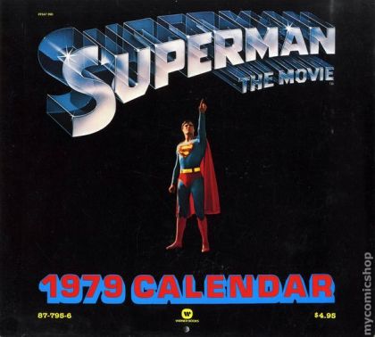 Year: 1979 - The year of Superman! Featuring scens from the definitive man of Steel movie this calendar includes Jor-El and Lara laucnhing baby Kal-El's space ship; Krypton exploding; Superman confronting the diabolical lex Luthor in his secret lair; Lois Lane rescued by Superman; the Fortress of Solitude; and much more! Also included is a collector's edition, giant, full color centerfold of the late great Christopher Reeves as Superman. Softcover, 13-in. x 11 1/2-in., 24 pages, full color. Cover price $4.95.