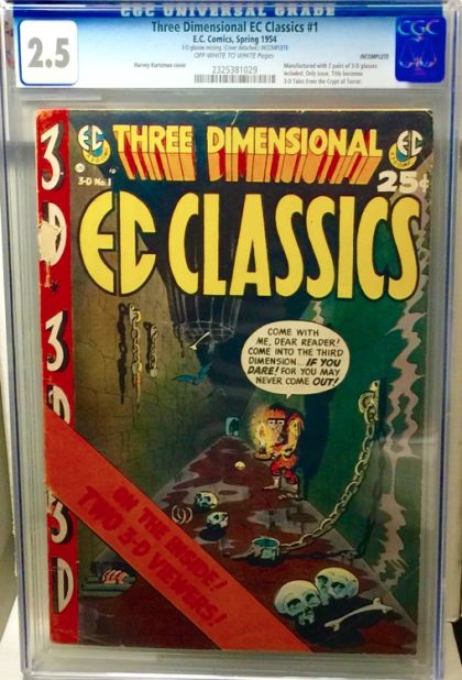 | Grader Notes | CGC 2.5 - 2325381029 CGC Cert # 2325381029 Title Three Dimensional EC Classics Issue 1 Issue Date Spring 1954 Issue Year 1954 Publisher E.C. Comics Grade 2.5 Page Quality OFF-WHITE TO WHITE Grade Date 06/30/2014 Grade Category Universal Pedigree INCOMPLETE Label Text 3-D glasses missing. (Cover detached.) INCOMPLETE Art Comments Harvey Kurtzman cover Key Comments Manufactured with 2 pairs of 3-D glasses included. Only issue. Title becomes 3-D Tales from the Crypt of Terror. Grader Notes Interior Detached from Cover Left Bottom Front Cover Small Bend Breaks Color Left Center Front Cover Piece Out Right Bottom Back Cover Crease Breaks Color |