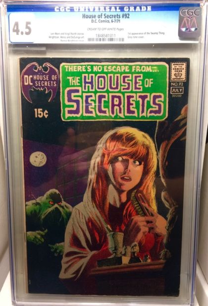 House of Secrets #92 (DC, 1971) CGC VG+ 4.5 Cream to off-white pages. First appearance and origin of Swamp Thing. Bernie Wrightson grey tone cover and art. Overstreet calls this a "classic" cover. Overstreet 2011 VG 4.0 value = $94. CGC census 3/12: 31 in 4.5, 597 higher.