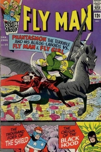 Cover by Paul Reinman. Written by Jerry Siegel. Art and cover by Paul Reinman. After the alien Phantasmon captures Fly-Man and Fly Girl, he and his 3 henchmen Sorro, Disastro and the Crumbler attempt to conquer the earth! Includes the origin of the Black Hood. Ad for The Mighty Crusaders. Cover and indicia say "Fly Man". Rocky and Bullwinkle star in a one-page Cheerios ad. Letter to the editor from comics writer Mike Friedrich. 36 pages, full color. $0.12. Cover price $0.12.