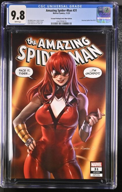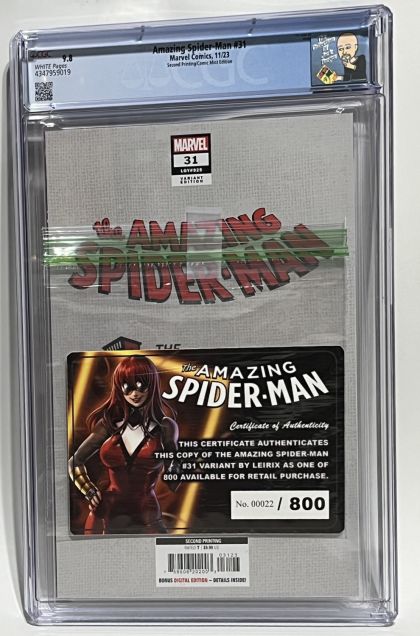 | Grader Notes | CGC Cert # 4347959019 Title Amazing Spider-Man Issue 31 Issue Date 11/23 Issue Year 2023 Publisher Marvel Comics Variant Second Printing/Comic Mint Edition Grade 9.8 Page Quality WHITE Grade Date 11/03/2023 Grade Category Modern Art Comments Zeb Wells story, Leirix Li cover John Romita Jr., Emilio Laiso, Scott Hanna & Z Carlos art Key Comments Amazing Spider-Man #925 Grader Notes Unavailable _______________________________ Comic Mint Edition #22/800 |