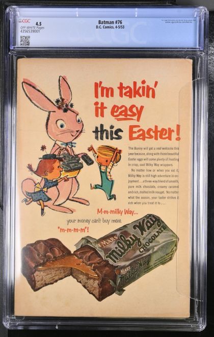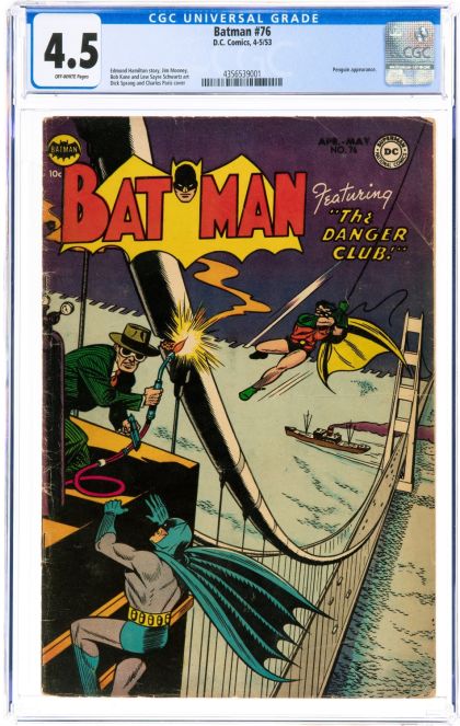 | Grader Notes | CGC Cert # 4356539001 Title Batman Issue 76 Issue Date 4-5/53 Issue Year 1953 Publisher D.C. Comics Grade 4.5 Page Quality OFF-WHITE Grade Date 11/30/2023 Grade Category Universal Art Comments Edmond Hamilton story, Jim Mooney, Bob Kane and Lew Sayre Schwartz art Dick Sprang and Charles Paris cover Key Comments Penguin appearance. Grader Notes light cover tanning light staining to cover light tears to cover moderate creasing to cover moderate spine stress lines to cover |