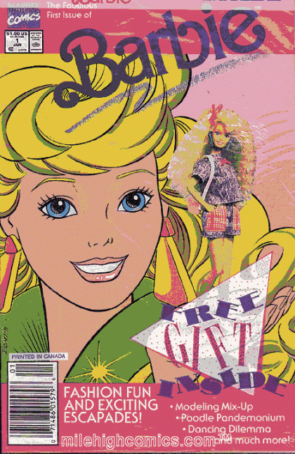 Do-Not-Disturb doorknob sign (cardboard); free gift inserted in polybagged copies. Cover art by John Romita, Sr. The Fashion Show Must Go On, script by Lisa Trusiani, pencils by Mary Wilshire, inks by John Lucas; Clarence C. Ment is out to give Barbie's fashion show a rocky start. Dirty Dancing, script by Lisa Trusiani, pencils by Mary Wilshire, inks by John Lucas; Courtney isn't really a klutz, but can Barbie convince her to cut loose and "cut some rug"? Prize, script by Lisa Trusiani, pencils by Mary Wilshire, inks by John Lucas; Dog-sitting can be fun ... except when the dog won't sit! Cover price $1.00.
