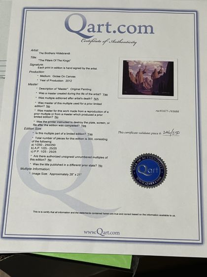 | Grader Notes | "The Pillars Of The Kings" Limited Edition Giclee on Canvas by The Brothers Hildebrandt. Numbered and Hand Signed by Greg Hildebrandt. Includes Certificate of Authenticity. Giclee Dimensions 28 x 21 COA #246/250 Greg and Tim Hildebrandt - "The Pillars Of The Kings" in "Misc. Goodies BOX #1" |