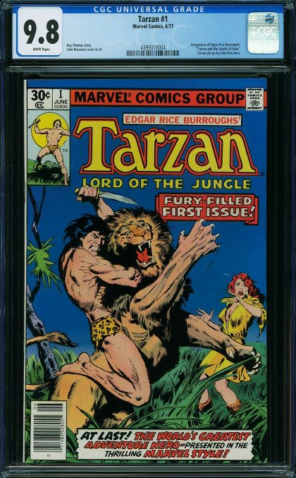 | Grader Notes | Title Tarzan Issue 1 Issue Date 6/77 Issue Year 1977 Publisher Marvel Comics Grade 9.8 Page Quality WHITE Grade Date 03/25/2024 Grade Category Modern Art Comments Roy Thomas story John Buscema cover & art Key Comments Adaptation of Edgar Rice Burroughs' ""Tarzan and the Jewels of Opar"" Tarzan pin-up by John Buscema. Grader Notes Unavailable |
