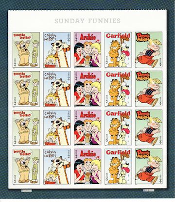 "The Sunday Funnies stamp pane honors Archie, Beetle Bailey, Dennis the Menace, Garfield and Calvin and Hobbes. The stamps will go on sale in July.