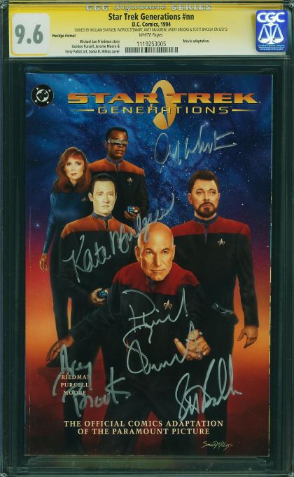 | Grader Notes | CGC Cert # 1119253005 Title Star Trek Generations Issue nn Issue Date 1994 Issue Year 1994 Publisher D.C. Comics Variant Prestige Format Grade 9.6 Page Quality WHITE Grade Date 09/12/2012 Grade Category Signature Label Text SIGNED BY WILLIAM SHATNER, PATRICK STEWART, KATE MULGREW, AVERY BROOKS & SCOTT BAKULA ON 6/2/12 Art Comments Michael Jan Friedman story Gordon Purcell, Jerome Moore & Terry Pallot art, Sonia R. Hillios cover Key Comments Movie adaptation. Grader Notes Bottom Front Cover Lite Rippling/Warping |