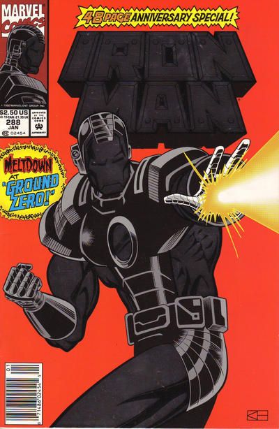 This special commemorative issue features a foil cover and celebrates Iron Man's 350th appearance. In this double-sized issue, Rhodey dons the black & white "War Machine" armor to battle Atom Smasher and Firepower while Tony Stark remains in his cryogenic freeze. New light is shed on Stark's troubled past.