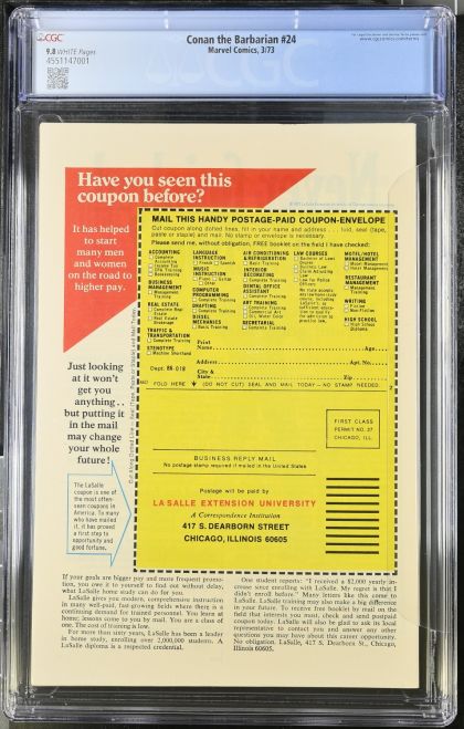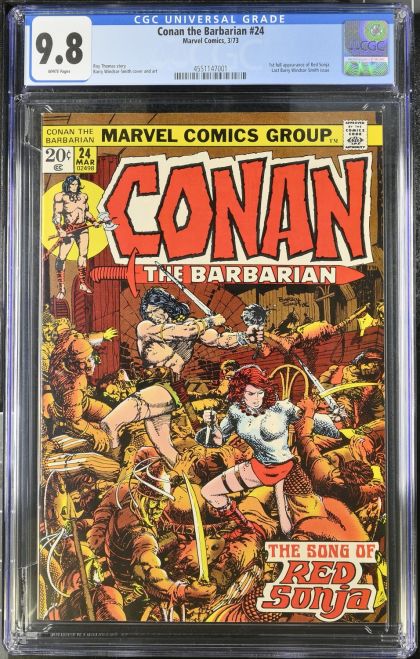 | Grader Notes | CGC Cert # 4551147001 Title Conan the Barbarian Issue 24 Issue Date 3/73 Issue Year 1973 Publisher Marvel Comics Grade 9.8 Page Quality WHITE Grade Date 2025-02-03 Grade Category Universal Art Comments Roy Thomas story Barry Windsor-Smith cover and art Key Comments 1st full appearance of Red Sonja. Last Barry Windsor-Smith issue. |