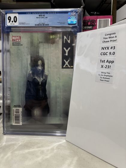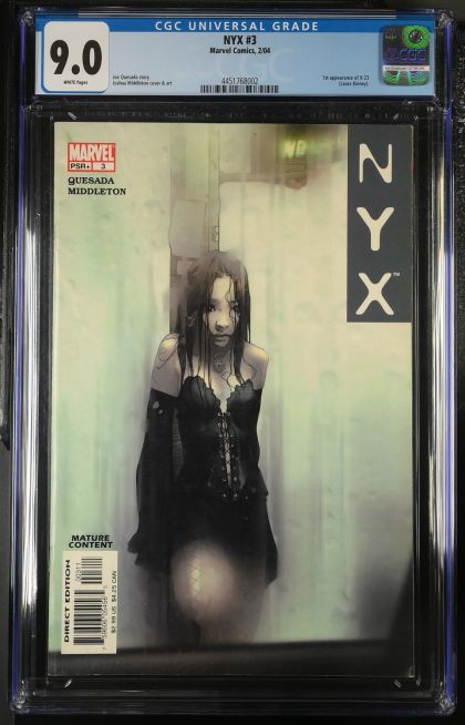 | Grader Notes | CGC Cert # 4451768002 Title NYX Issue 3 Issue Date 2/04 Issue Year 2004 Publisher Marvel Comics Grade 9.0 Page Quality WHITE Grade Date 07/01/2024 Grade Category Modern Art Comments Joe Quesada story Joshua Middleton cover & art Key Comments 1st appearance of X-23 (Laura Kinney). Grader Notes Unavailable |