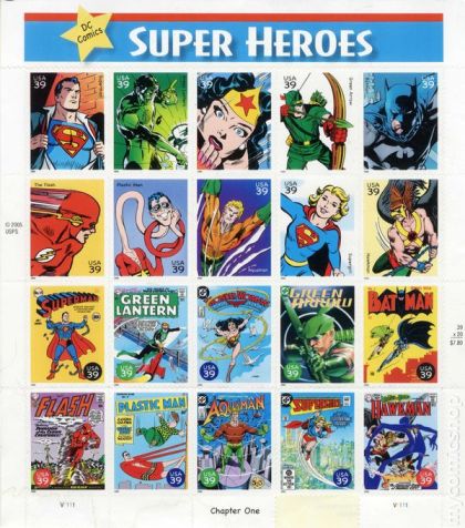 Chapter One: DC Comics Super Heroes - This sheet includes 20 self adhesive 39c collectible stamps. Characters featured on the stamps include: Superman, Batman and Robin, Wonder Woman, Green Lantern Hal Jordan, Green Arrow, Aquaman, the Flash, Plastic Man, Hawkman and Hawkgirl, and Supergirl. Short bios for the heroes can be found on the backside of the sheet.