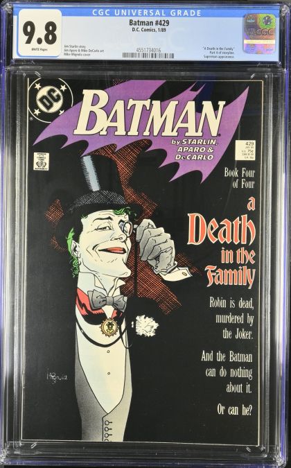 | Grader Notes | CGC Cert # 4551734016 Title Batman Issue 429 Issue Date 1/89 Issue Year 1989 Publisher DC Comics Grade 9.8 Page Quality WHITE Grade Date 2025-04-09 Label Category Universal Art Comments Jim Starlin story Jim Aparo & Mike DeCarlo art Mike Mignola cover Key Comments Superman appearance. |