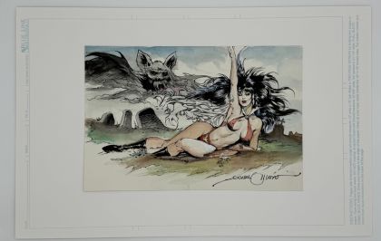 Brief Item Description: This stunning original artwork by Gonzalo Mayo showcases the iconic *Vampirella* in a moment of sultry repose, lying gracefully with a bat figure looming in the sky above her. Rendered in intricate pencil, pen, and ink, the piece is a beautiful example of Mayo's masterful command of linework, shading, and composition. Gonzalo Mayo was a prominent artist during the golden years of *Warren* publishing, contributing to the legendary *Vampirella* series and other cult classic titles. His work from this era is beloved for its atmospheric detail and rich, dynamic visuals that captured the essence of horror and fantasy with both elegance and intensity. While the exact date of this piece remains unknown, it is unmistakably a product of Gonzalo Mayos distinct style, which blends graceful figures with dark, evocative storytelling. The bat hovering behind Vampirella adds a touch of gothic drama, while her languid pose speaks to the character's sensual, otherworldly allure. This artwork is a perfect addition for collectors of *Vampirella* or those seeking a piece of the golden era of horror comic art. Its rich detail and emotional depth make it a striking homage to both Mayo's artistic legacy and the iconic figure of Vampirella herself.