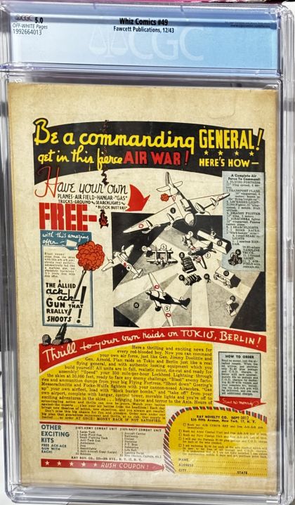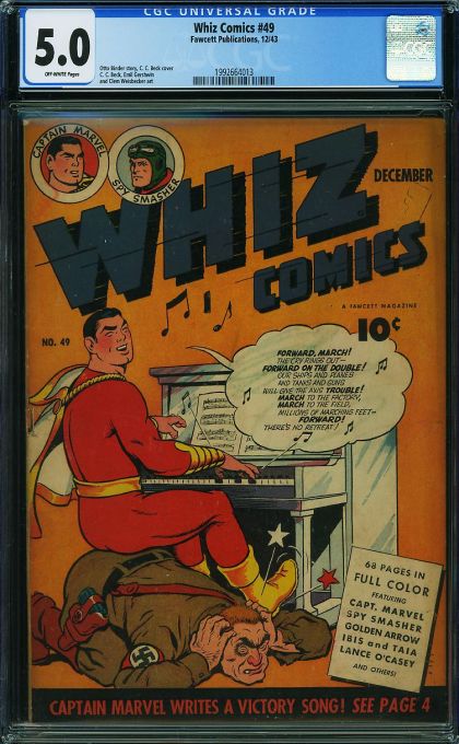 | Grader Notes | CGC Cert # 1992664013 Title Whiz Comics Issue 49 Issue Date 12/43 Issue Year 1943 Publisher Fawcett Publications Grade 5.0 Page Quality OFF-WHITE Grade Date 2018-11-28 Grade Category Universal Art Comments Otto Binder story, C.C. Beck cover C.C. Beck, Emil Gershwin and Clem Weisbecker art Grader Notes staple tear light creasing to cover light tears to cover light staining to cover staple detached front cover |