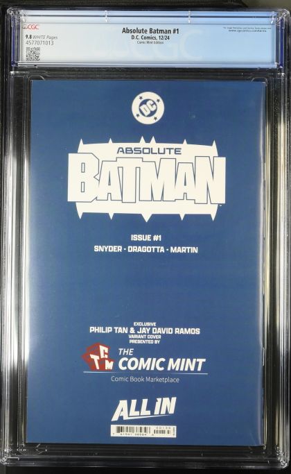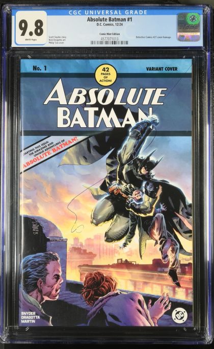 | Grader Notes | CGC Cert # Title Absolute Batman Issue 1 Issue Date 12/24 Issue Year 2024 Publisher D.C. Comics Variant Comic Mint Edition Grade 9.8 Page Quality WHITE Grade Date 2025-04-14 Grade Category Modern Art Comments Scott Snyder story Nick Dragotta art Philip Tan cover Key Comments Detective Comics #27 cover homage. |