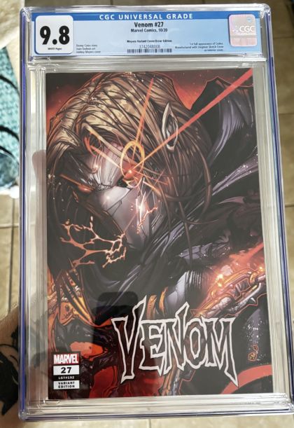| Grader Notes | Venom #27 (Meyers Variant Cover/Error Edition) CGC Cert # 3742048008 Title Venom Issue 27 Issue Date 10/20 Issue Year 2020 Publisher Marvel Comics Variant Meyers Variant Cover/Error Edition Grade 9.8 Page Quality WHITE Grade Date 2025-07-25 Label Category Universal Art Comments Donny Cates story Juan Gedeon art Jonboy Meyers cover Key Comments 1st full appearance of Codex. Manufactured with Stegman Sketch Cover as interior cover. |