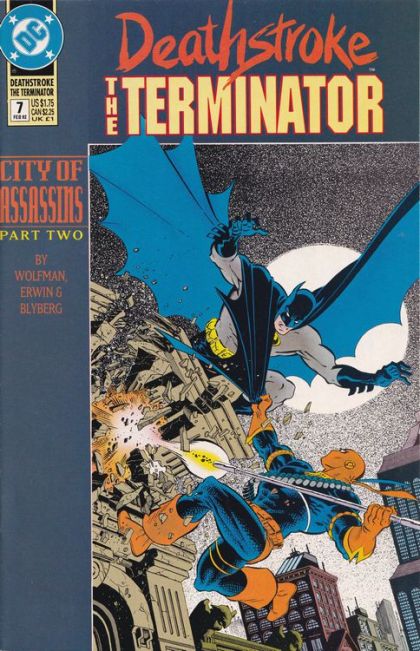 City of Assassins: Part 2 of 4. "The Rival!" Guest-starring Batman. Story by Marv Wolfman. Art by Steve Erwin and Will Blyberg. Cover by Mike Zeck. There are three killers on the loose in the streets of Gotham and the Terminator is one of them. It's time for Commissioner Gordon to call in some help. It's the throw-down of the century as Deathstroke the Terminator goes toe-to-toe with the Batman! You won't believe who wins. Cover price $1.75.