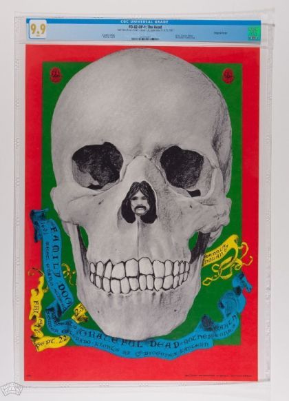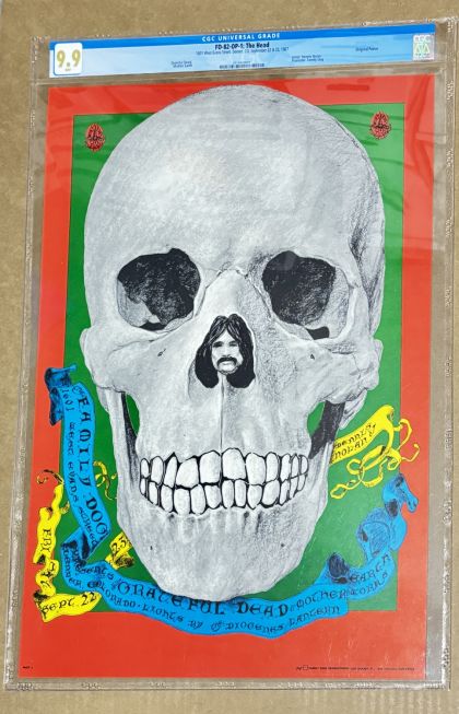 A HIGH-GRADE CGC 9.9 Original Poster! The Grateful Dead played a pair of shows at the short-lived Family Dog Venue in Denver Colorado in 1967. This advertisement for said event is a real sleeper among Dead posters. It features skull imagery with a pigpen nose. In addition, Grateful Dead is spelled out in the Skull's teeth.