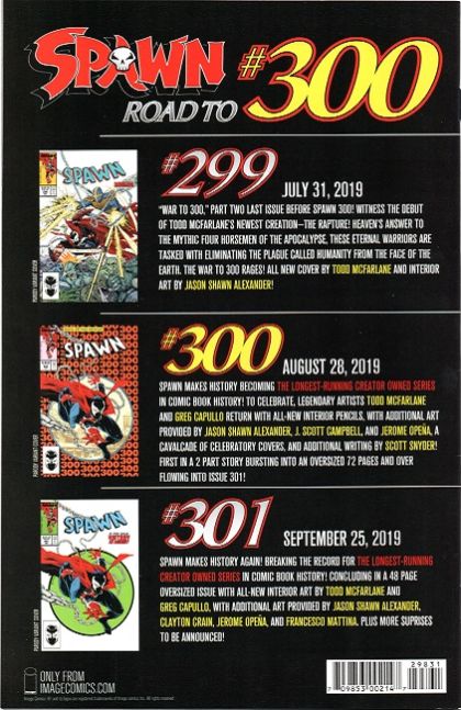 "WAR TO 300," Part One-TWO ISSUES 'TIL SPAWN #300! Spawn vs. the full might of Heaven's newest Godsend-ROUND 1! TODD McFARLANE and JASON SHAWN ALEXANDER up the ante in this lead-up to SPAWN's record-setting 300th issue, featuring TODD McFARLANE's special parody recreation of one of his own classic comic book covers!