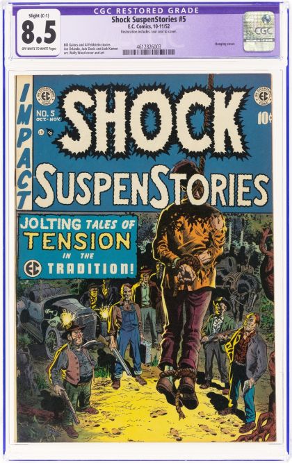 Shock SuspenStories #5 (EC, 1952) CGC Apparent VF+ 8.5 Slight (C-1) Off-white to white pages. Hanging cover by Wally Wood. Art by Wood, Jack Davis, Jack Kamen, and Joe Orlando. Stories by Bill Gaines and Al Feldstein. CGC notes, "Restoration includes: tear seal to cover." Overstreet 2024 GD 2.0 value = $131; VG 4.0 value = $262; FN 6.0 value = $393; VF 8.0 value = $1,048.
