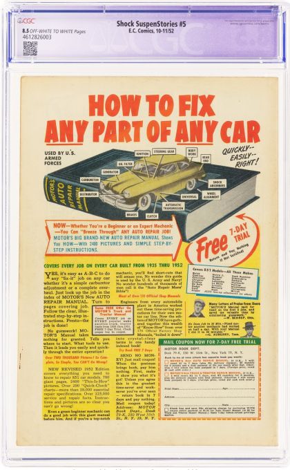 | Grader Notes | CGC Cert # 4612826003 Title Shock SuspenStories Issue 5 Issue Date 10-11/52 Issue Year 1952 Publisher E.C. Comics Grade 8.5 Page Quality OFF-WHITE TO WHITE Grade Date 2025-07-28 Label Category Restored Label Text Restoration includes: tear seal to cover. Art Comments Bill Gaines and Al Feldstein stories Joe Orlando, Jack Davis and Jack Kamen art, Wally Wood cover and art Key Comments Hanging cover. Grader Notes very small staple tear top staple small rust stain left center of back cover light tanning cover |
