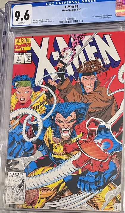 | Grader Notes | CGC Cert # 3837886011 Title X-Men Issue 4 Issue Date 1/92 Issue Year 1992 Publisher Marvel Comics Grade 9.6 Page Quality WHITE Grade Date 03/21/2022 Grade Category Modern Art Comments Jim Lee & John Byrne story Jim Lee & Scott Williams cover & art Key Comments 1st appearance of Omega Red (Arkady Rossovich). Grader Notes Unavailable |