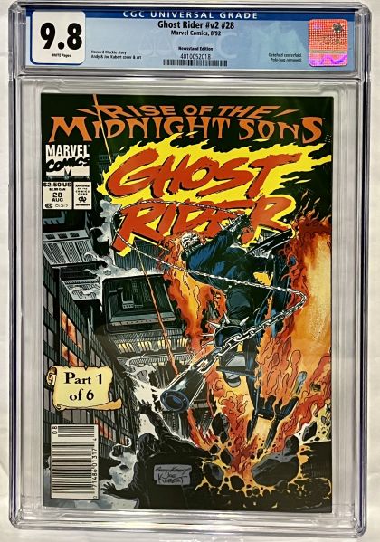 | Grader Notes | CGC Cert # 4010052018 Title Ghost Rider Issue v2 #28 Issue Date 8/92 Issue Year 1992 Publisher Marvel Comics Grade 9.8 Page Quality WHITE Grade Date 11/22/2022 Grade Category Modern Pedigree Newsstand Edition Art Comments Howard Mackie story Andy & Joe Kubert cover & art Key Comments Gatefold centerfold. Poly-bag removed. Grader Notes Unavailable |