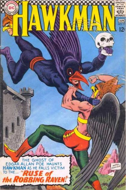 Joey Makk, resentful that his early crime career as trainer of a raven which stole for him had been halted when Eddie Powe beat him up and recovered the loot, has befriended Powe now, while planning to humiliate him publicly. Makk gives Powe a trained raven that can recite Edgar Allan Poe's famous poem, but which also spies on Powe, and reports back to Makk everything it has heard all day. Thus, Makk learns that Powe has found an unknown Edgar Allan Poe novel, and is keeping the authenticated manuscript in his library until the public announcement and donation to Midway City Museum is made, and so, as the Raven, he gathers his criminal gang and raids the library. Although Hawkman captures the gang, Raven escapes, his mission accomplished; he has switched a fake manuscript for the real one. Eddie Powe is disgraced on TV when a literary authority recognizes the forgery, and he suspects Makk, since the trained raven is also missing. Hawkman tracks down and speaks with the bird, and then surprises the Raven when he tries to fence the book. The manuscript recovered, and Makk in jail, Powe is exonerated