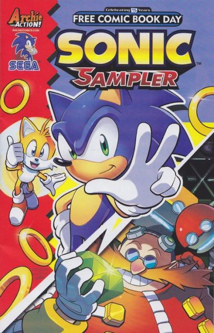 Get the best of both worlds with the Sonic Sampler! Hot on the heels of the all-new epic Sonic comics event, 'Panic in the Sky,' comes a supersonic sampling of stories for Free Comic Book Day! Join Sonic and friends as they band together to save the world from the evil ambitions of Dr. Eggman in these select stories from Sonic the Hedgehog and Sonic Universe! Plus, get a sneak peek of what's to come with a special 'Fast Forward Feature' that you'll have to see to believe!