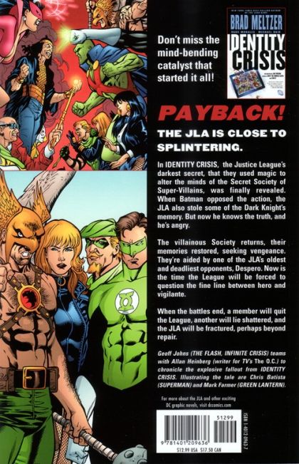 Written by Geoff Johns & Allan Heinberg Art by Chris Batista & Mark Farmer Cover by Rags Morales A new volume collecting the amazing sequel to IDENTITY CRISIS from JLA #115-119, written by Geoff Johns (INFINITE CRISIS, JSA, THE FLASH) and Allan Heinberg (The O.C., Young Avengers) with stunning art by Chris Batista (LEGION) and Mark Farmer (JUSTICE LEAGUE: THE NAIL)! In the wake of IDENTITY CRISIS, the JLA decides the time has come to tell Batman that they stole part of his memory. But, the League is attacked by the Secret Society of Super-Villains - out for vengeance now that their own memories are restored. As the JLA battles, the Martian Manhunter confronts Despero - the alien conqueror and the one behind the villains' memory-restoration. By the time the dust settles, the JLA may have won the battle but lost the war!