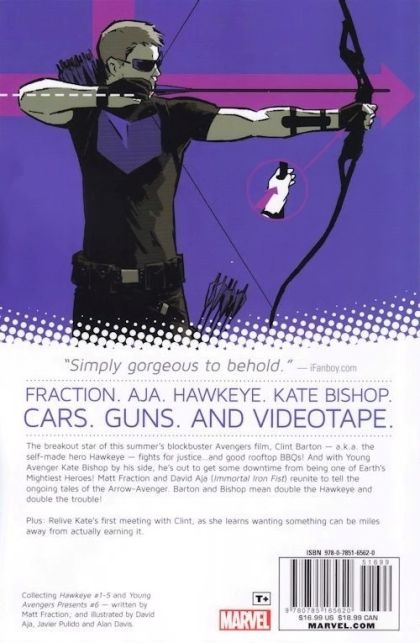 Fraction. Aja. Hawkeye. Kate Bishop. Cars. Guns. And videotape. The breakout star of this summer's blockbuster Avengers film, Clint Barton - a.k.a. the self-made hero Hawkeye - fights for justice?and good rooftop BBQs! And with ex-Young Avenger Kate Bishop by his side, he's out to get some downtime from being one of Earth's Mightiest Heroes! Matt Fraction and David Aja (IMMORTAL IRON FIST) reunite to tell the ongoing tales of the Arrow-Avenger. Barton and Bishop mean double the Hawkeye and double the trouble! Plus: Relive Kate's first meeting with Clint, as she learns wanting something can be miles away from actually earning it. Collecting HAWKEYE (2012) #1-5 and YOUNG AVENGERS PRESENTS #6.