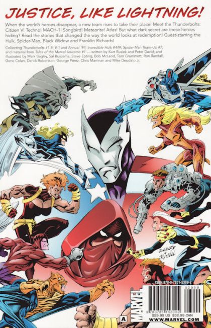 Written by KURT BUSIEK & PETER DAVID Penciled by MARK BAGLEY, SAL BUSCEMA, STEVE EPTING, BOB MCLEOD, TOM GRUMMETT, RON RANDALL, GENE COLAN, DARICK ROBERTSON, GEORGE P?REZ, CHRIS MARRINAN & MIKE DEODATO JR. Cover by MARK BAGLEY Justice, like lightning! When the world's heroes disappear, a new team rises to take their place! Meet the Thunderbolts: Citizen V! Techno! MACH-1! Songbird! Meteorite! Atlas! But what dark secret are these heroes hiding? Read the stories that changed the way the world looks at redemption! Guest-starring the Hulk, Spider-Man, Black Widow and Franklin Richards! Collecting THUNDERBOLTS #1-5, #-1 and ANNUAL '97; INCREDIBLE HULK (1968) #449; SPIDER-MAN TEAM-UP #7; and material from TALES OF THE MARVEL UNIVERSE #1 296 PGS./Rated A