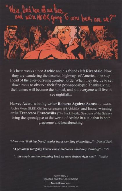 Kick off Halloween with the smash-horror hit! It's been weeks since Archie and his friends left Riverdale. Now they wander the deserted highways of America, one step ahead of the relentless zombie horde. When they decide to set down roots to observe their first post-apocalypse Thanksgiving, Mr. Lodge leads a team into the forests of Pennsylvania to find dinner... but the hunters soon become the hunted, and not all of the gang will make it out of the woods alive! For TEEN+ readers.