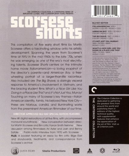 This compilation of five early short films by Martin Scorsese offers a fascinating window onto his artistic development. Spanning the years from Scorsese’s time at NYU in the mid-1960s to the late ’70s, when he was emerging as one of the era’s most electrifying talents, Scorsese Shorts centers on the intimate home movie Italianamerican—a loving snapshot of the director’s parents—and American Boy, a freewheeling portrait of the larger-than-life raconteur Steven Prince. Also included are The Big Shave, a daringly visceral response to America’s involvement in Vietnam, and the bracing student films What’s a Nice Girl Like You Doing in a Place Like This? and It’s Not Just You, Murray! Touching on many of Scorsese’s key themes—Italian American identity, family, his beloved New York City—these are hilarious, candid, and illuminating works from the preeminent American filmmaker of our time.